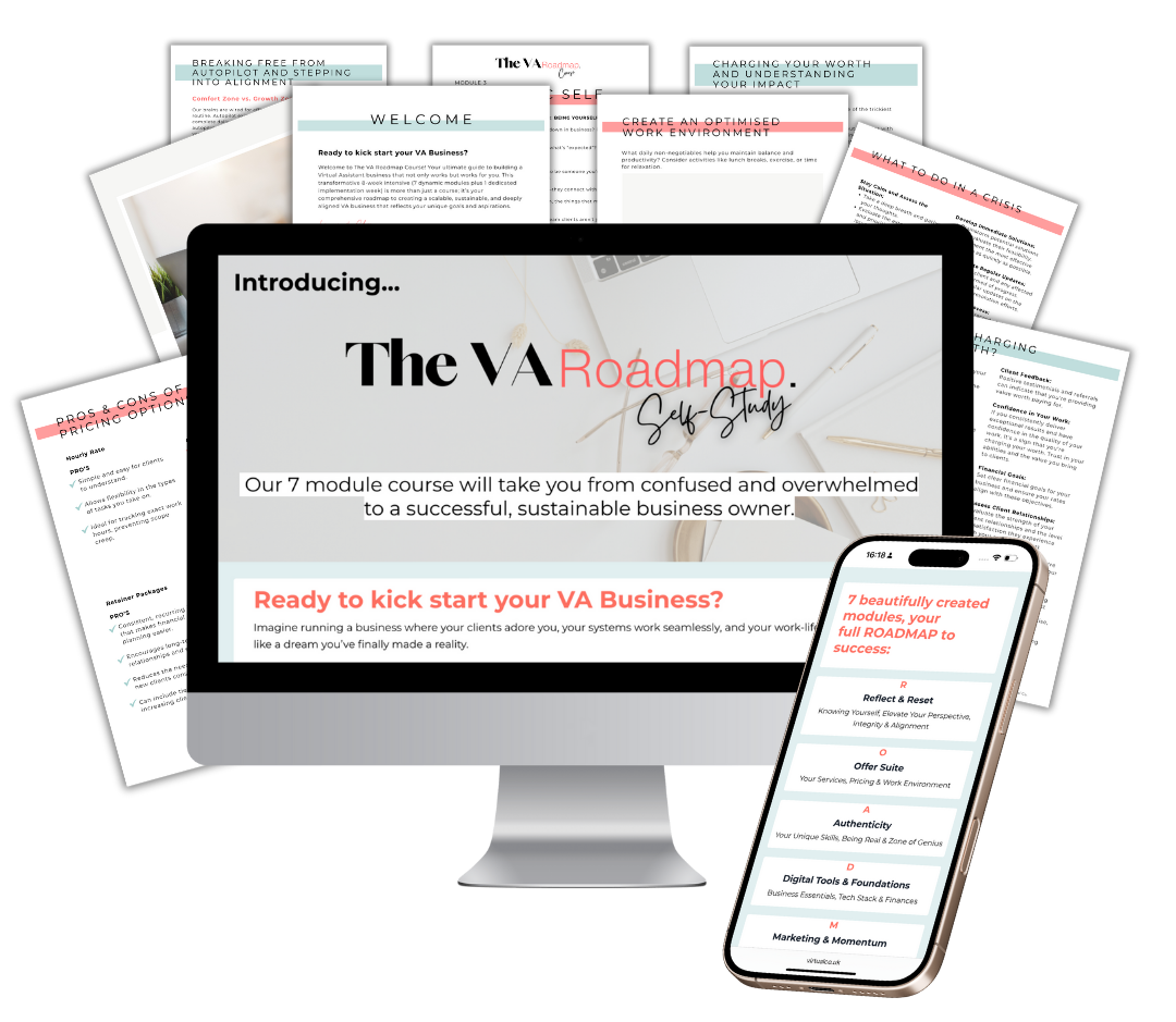 Our 7 module course will take you from confused and overwhelmed to a successful, sustainable business owner. This isn’t just a course; it’s your ROADMAP to building a successful, sustainable VA Business with strong foundations, clear services and the confidence to attract and onboard clients, even if you don’t know where to start yet.
